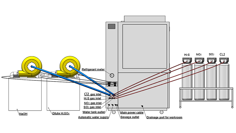 ห้องของอุตสาหกรรมได้อย่างแม่นยำควบคุมส่วนผสมของ H2S, SO2, NO2และ Cl2ที่ความเข้มข้นตั้งแต่10 PPB ถึง500 PPB เพื่อให้มั่นใจว่าการทำซ้ำที่ถูกต้องของบรรยากาศที่มีฤทธิ์กัดกร่อน ตัวควบคุมการไหลของมวล (mfcs) รักษาอัตราการไหลที่เสถียรระหว่าง0.5ถึง2.0มิลลิลิตร/นาทีต่อก๊าซทำให้สามารถเปิดรับแสงได้สม่ำเสมอสำหรับตัวอย่างทั้งหมด