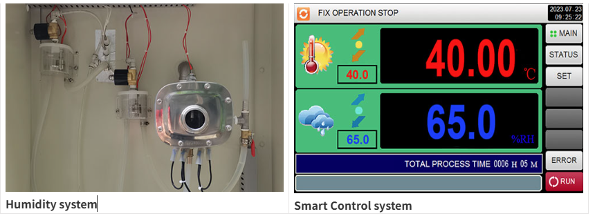 ระบบควบคุมที่ใช้งานง่ายช่วยให้สามารถตั้งค่าล่วงหน้าหรือโปรไฟล์ที่กำหนดเองได้อย่างเต็มที่รวมถึงการไล่ระดับรอบขั้นตอนหรือการจำลองสภาพที่รุนแรง การศึกษาอายุเร่งสามารถดำเนินการเพื่อทำนายความมั่นคงในระยะยาวในระยะเวลาอันสั้น
